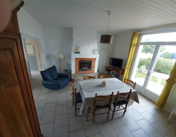 Séjour ouvert sur la cuisine aménagée, cheminée...