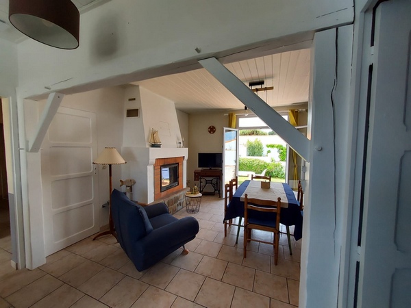 Séjour ouvert sur la cuisine aménagée, cheminée...
